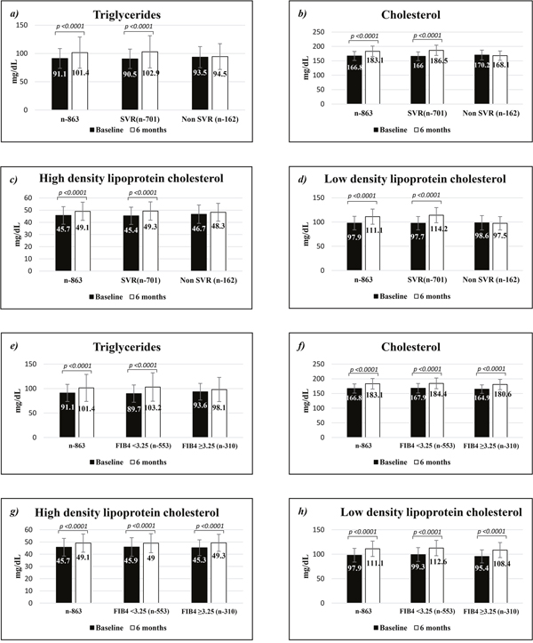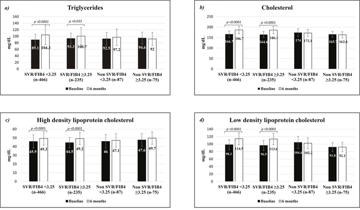 Figure 2: The change of serum lipid levels in baseline and after 6 months of antiviral treatment stratified by sustained virologic response and FIB4. Comparison of serum (a) triglycerides, (b) cholesterol, (c) high density lipoprotein cholesterol and (d) low density lipoprotein cholesterol levels in baseline and after 6 months of antiviral treatment.