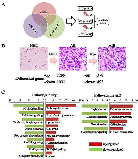 Figure 1: Changes in genes expression from NBT to grade II and grade II to grade III astrocytomas. (A) Differential genes were obtained from overlapping CGGA, GSE16011 and REMBRANDT databases. (B) A hematoxylin and eosin stained section was performed to determine the pathological type and grade and dysregulated genes were divided into up-regulated and down-regulated during malignant progression of astrocytomas. (C) KEEG pathways analysis performed using these differential expression genes on the DAVID website.