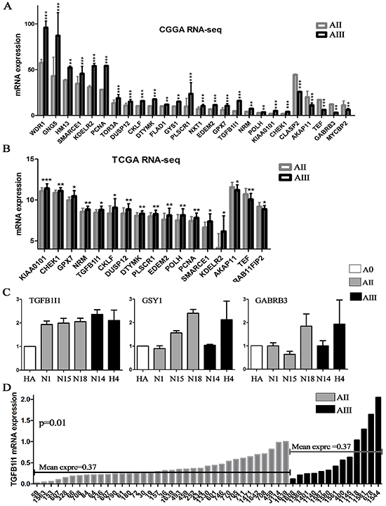 Figure 3: Candidate genes were confirmed on RNA-sequencing data and validated by qPCR. (A and B) The candidate genes obtained by analysis of microarrays were further confirmed on two RNA-seq database including 57 AII and 71 AIII (CGGA and TCGA); (C) The top 3 survival associated genes, GYS1, TGFB1I1 and GABRA3, were validated by qPCR in 6 cell lines (2 commercialized cell lines and 4 primary culture cells). (D) The expression level of TGFB1I1 was further validated on additional 49 samples (36 AIIs and 13 AIIIs). *p<0.05, **p<0.01, ***p<0.001