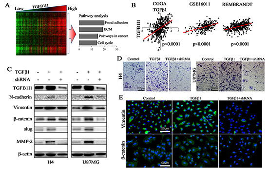 Figure 5: TGFB1I1 regulated TGF-β1 induced EMT. (A) Correlation analysis performed in 310 samples with mRNA microarrays and a cluster of 308 TGFB1I1 associated genes were obtained (R>0.6, p<10–30); Pathway analysis was performed using the 308 TGFB1I1 associated genes. (B) The expression level of TGFB1I1 was positively correlated with the expression level of TGF-β1 in the three databases. (C and E) TGFB1I1 and EMT associated markers were significantly increased in TGF-β1 stimulated cells and TGFB1I1 shRNA resulted in the decreasing expression of N-cadherin, vimentin, slug, β-catenin and MMP-2. (D) A significantly decreased invasion was observed in the TGFB1I1 shRNA treated cells compared with TGF-β1 stimulated cells. *p<0.05