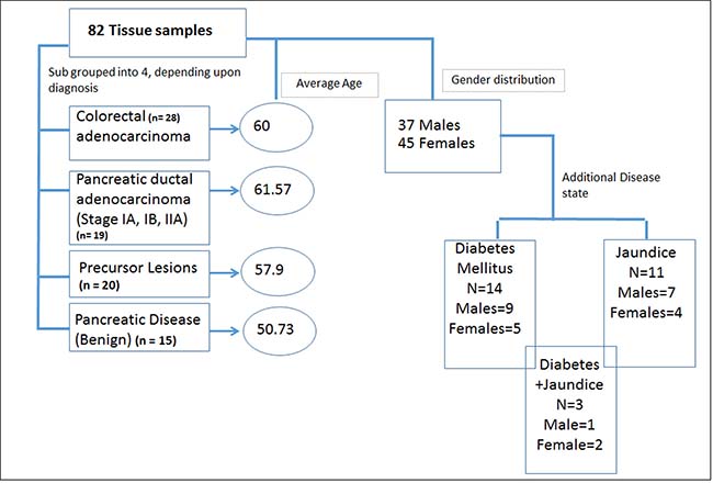 We leveraged pristinely collected and extensively annotated post-surgical samples form Indivumed repository at the Georgetown University Hospital. The clinical cohort used in this study consisted of a local population of patients with clinical presentation of benign (n = 15), precancerous lesions (PL) (n = 20) or early stage (IA, IB, IIA) PDAC (n = 19). The benign pancreatic disease group included patients with a clinical diagnosis of pancreatitis and pancreatic cystic neoplasms that have a benign natural history. While a history of pancreatitis is a known risk factor for the development of PDAC, pancreatitis is not a neoplastic process. Pancreatic cystic neoplasm included in the benign pancreatic disease cohort, such as serous cystadenomas, are almost never malignant and do not require imaging frequent surveillance in clinical practice. PL included patients who underwent surgical resection for IPMN (n = 14), MUC (n = 3), or other (n = 3) and were judged to be at high risk for progression or association of invasive disease. Criteria for resection was based on commonly used consensus clinical practice guidelines [42]. Although PLs exhibit a spectrum of clinical behaviors, this patient cohort was enriched for cystic pancreatic neoplasms with clinical, radiologic, and/or cytologic features associated with progression to invasive pancreatic cancer. CRC was used as a disease control group to test biomarker specificity (n = 28). The clinical characteristics are detailed in Supplementary Table 1. The average age of the cohort was 58.6 years with almost uniform gender distribution. A total of 14 patients including six PDAC and five benign cases also had a diagnosis of Type II or Type I diabetes mellitus (DM), while a total of 11 patients had jaundice as a co-morbidity in benign (n = 2) and PDAC (n = 9) (Figure 1 and Supplementary Table 1). The PDAC, benign and PL cohorts did not receive any chemotherapy or radiation treatment prior to surgery.