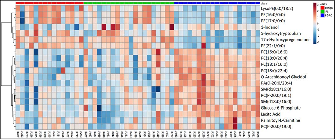 Figure 3: Heat map illustration of dysregulated metabolites in pancreatic lesions (PL) and pancreatic ductal adenocarcinoma (PDAC) gro ups as compared to the benign pancreatic disease group.
