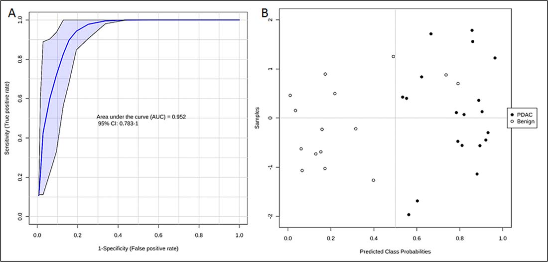 Figure 4: ROC curve (A) and predicted class probabilities for six metabolite panel (B) showing high classification accuracy between PDAC and Benign.