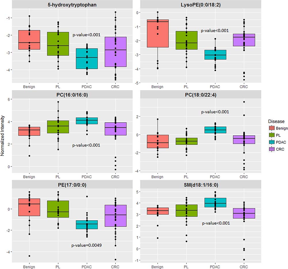 The six metabolite panel consisted of LysoPE (0:0/18:2), PC(16:0/16:0), PC(18:0/22:4), PE (17:0/0:0), SM(d18:1/16:0) and 5-hydroxytryptophan. Several groups have reported the importance of lipids as powerful discriminators between PDAC and normal controls [51], [18]. 5-hydroxytryptophan is an intermediate in serotonin biosynthesis; decreased levels in PL and PDAC could reflect increased conversion to serotonin which has been implicated in tumor growth and progression [52, 53]. Taken together, our results show markers that can be early markers of disease onset and progression and need further validation for exploring potential clinical utility.