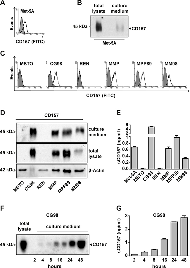 Figure 1: Analysis of CD157 expression and release in malignant and non-malignant mesothelial cell lines. Flow cytometric analysis of CD157 expression in (A) Met-5A non-malignant mesothelial cells and (C) six MPM cell lines. In each sample, 104 cells were analysed; x-axis = fluorescence intensity, y-axis = number of cells (events). White histograms represent the expression of membrane CD157 in live cells analysed by the SY/11B5 mAb, shaded histograms indicate isotype-matched control mAb. Western blot analysis of CD157 in (B) Met-5A cells and (D) six MPM cell lines maintained in serum-free culture medium for 48 hours. Proteins were separated by SDS-PAGE in non-reducing conditions, blotted and probed with the SY/11B5 anti-CD157 mAb; β-Actin was used as a loading control of the total lysates. One representative experiment is shown (n = 3). (E) sCD157 was measured by the double determinant ELISA described in Materials and Methods, in serum-free culture medium of the indicated cell lines. Results are expressed as ng/ml of soluble CD157 and histograms represent the mean ± s.e.m. of three experiments performed in duplicate. (F) Western blot time-course analysis of sCD157 accumulated in serum-free culture medium of CG98 MPM cells. Proteins were precipitated by TCA, separated by SDS-PAGE in non-reducing conditions, transferred to PVDF membrane and probed with the SY/11B5 anti-CD157 mAb. One representative experiment is shown (n = 2). (G) Quantification of sCD157 concentration by the double-determinant ELISA in serum-free culture medium of CG98 MPM cells at the indicated time points. Results are expressed as ng/ml of soluble CD157. Histograms represent the mean value ± s.e.m. of three experiments performed in duplicate.