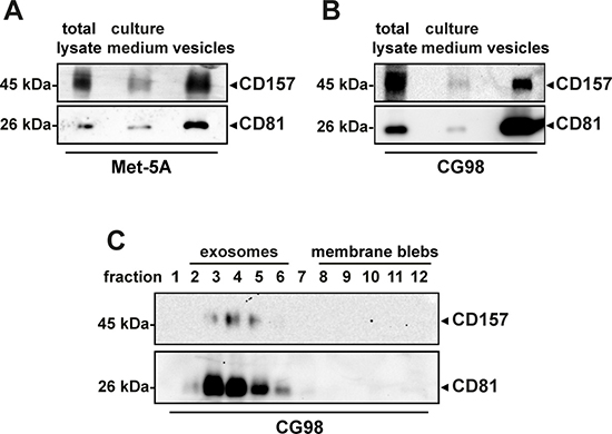 Figure 2: Analysis of CD157 expression in vesicles released by mesothelial cells. Western blot analysis of CD157 expressed in total cell lysate (30 μg/lane), cell culture medium (1 ml, TCA precipitated) and vesicles (30 μg/lane) from (A) non-malignant Met-5A mesothelial cells or (B) CG98 mesothelioma cells, detected by SY/11B5 mAb. A representative experiment is shown (n = 3). (C) Western blot analysis of CD157 and CD81 expression in exosomes obtained from serum-free culture medium of CG98 cells by sucrose density gradient fractionation. Twelve fractions were collected from the top of the gradient, proteins from each fraction were precipitated with methanol/chloroform, separated by 10% SDS-PAGE, transferred to PVDF membranes and immunoblotted with anti-CD157 or anti-CD81 mAb. A representative experiment is shown (n = 3).