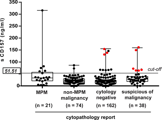 Figure 5: Contribution of sCD157 to the cytological diagnosis of MPM. sCD157 concentrations in pleural effusions were plotted against the diagnosis established by cytopathology. Each data point indicates mean concentration of sCD157 of a single effusion sample and represents the mean value of three independent experiments performed in duplicate. Horizontal dashed line indicates the cut-off corresponding to the 75th percentile (sCD157 = 51.51 ng/ml). Boxes indicate the range (25th–75th percentiles), whiskers indicate major and minor values; the horizontal line within the boxes indicates the median sCD157 concentration of each group. Red dots highlight nine effusions from MPM patients with sCD157 ≥51.51 ng/ml, not diagnosed by cytology.