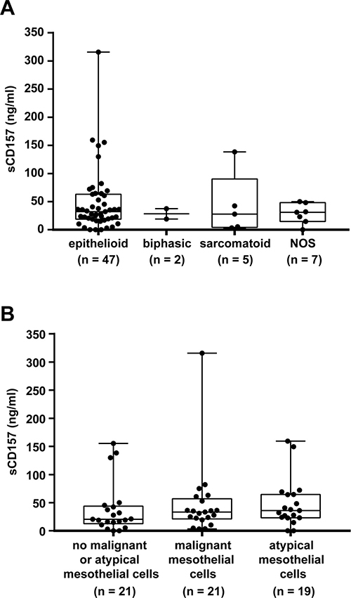 Our data indicate that, in this study, evaluation of sCD157 did not provide prognostic information for patients with MPM, even though the median survival of high sCD157 MPM patients (at diagnosis) was shorter than those of low sCD157 patients. Nevertheless, this result requires careful interpretation considering the small number of patients examined, and bearing in mind that the biphasic histotype, in which CD157 expression levels and prognosis are correlated [24] are under-represented in the analyzed case series.