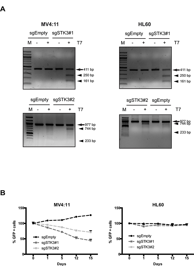 Figure 2: STK3 knock-out using CRISPR-Cas9 phenocopies RNAi results. (A) MV4:11 and HL60 cells were transduced with vectors containing two different gRNAs targeting STK3 (sgSTK3#1 and sgSTK3#2) or an empty vector (sgEmpty, negative control). Genomic PCR prepared from cells with indicated treatments in an T7E1 assay are shown. Arrows indicate the size of wild-type PCR products, arrowheads indicate the expected cleavage products of the T7E1 assays. (B) Effects of STK3 knock-out in MV4:11 and HL60 cells. Changes in the percentage of GFP+ cells are presented after normalization. GFP percentage was normalized to day 2 post infection and presented as day 0. Data are presented as mean ± SD.