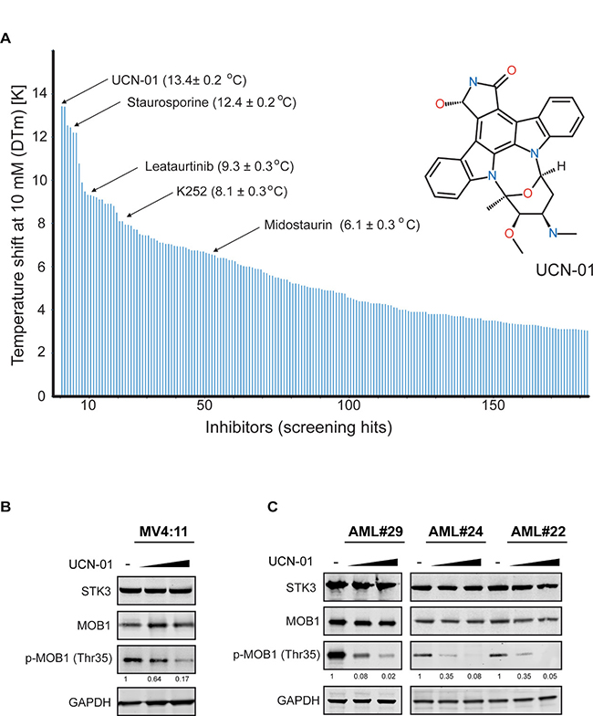 In search for a chemical inhibitor targeting STK3 kinase activity, we screened a chemical compound library of about 3000 commercially available kinase inhibitors against the STK3 kinase domain using temperature shift (ΔTm) assays [22]. Screening this library, we identified 184 inhibitors with shifts larger than 3 degrees. The strongest hit was the staurosporine derivative UCN-01 along with other derivatives of this scaffold (Figure 4A). UCN-01 has narrow kinase selectivity compared to the broad spectrum inhibitor staurosporine but it has been described to inhibit diverse kinases [23–26]. However, inhibition of STK3 has not been reported so far. To investigate whether UCN-01 inhibits STK3 kinase activity in cells, we treated MV4:11 cells with increasing concentrations of UCN-01 and subsequently analyzed phospho-MOB1 levels, a validated direct target of STK3 [27, 28]. Without changes in either total STK3 protein or total MOB1 protein expression, phosphorylated MOB1 levels diminished in a dose dependent manner (Figure 4B). Similar results were also obtained in several primary AML cells (Figure 4C), demonstrating that UCN-1 treatment reduces STK3 activity in a dose dependent manner.