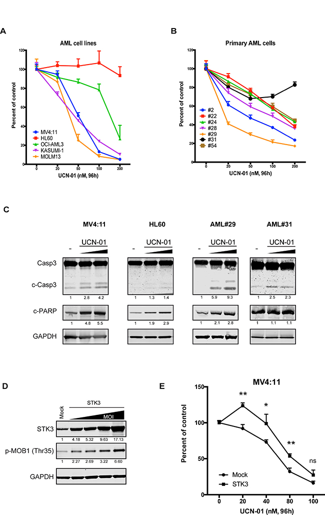 To test if UCN-01 treatment affects AML cell line growth, we incubated cells with increasing doses of UCN-01 and monitored proliferation rates. Remarkably, the results revealed a strong correlation between UCN-01 sensitivity and STK3 knock-down response in the tested lines (Figure 5A). Furthermore, this correlation also extended to primary AML samples (Figure 5B). In particular, HL60 and AML#31 cells were resistant to UCN-1 treatment, whereas other samples showed sensitivity to inhibitor treatment in a dose dependent manner. Moreover, further analyzes of the levels of pro-apoptotic (cleaved Caspase3 and cleaved PARP) proteins by western blot confirmed that UCN-01 induces apoptosis in a dose dependent manner primarily in MV4:11 and AML#29 cells but not in HL60 and AML#31 cells (Figure 5C). To validate a causal link between the UCN-1 induced proliferative effects via STK3 inhibition, we performed STK3 over-expression studies in combination with UCN-1 treatment. We reasoned that over-expression of STK3 should make the cells more resistant to UCN-01 treatment. We first confirmed that over-expression of STK3 gave rise to a functional form of the STK3 kinase based on the increased phosphorylation levels of the downstream substrate MOB1 (Figure 5D). We then applied UCN-01 to cells at increasing concentrations and compared the growth rates of wild-type and STK3 over-expressing cells. We observed that MV4:11 cells over-expressing STK3 were more resistant to drug exposure (Figure 5E), further supporting that UCN-1 inhibits STK3 and that this inhibition leads to cell death in sensitive AML cells.