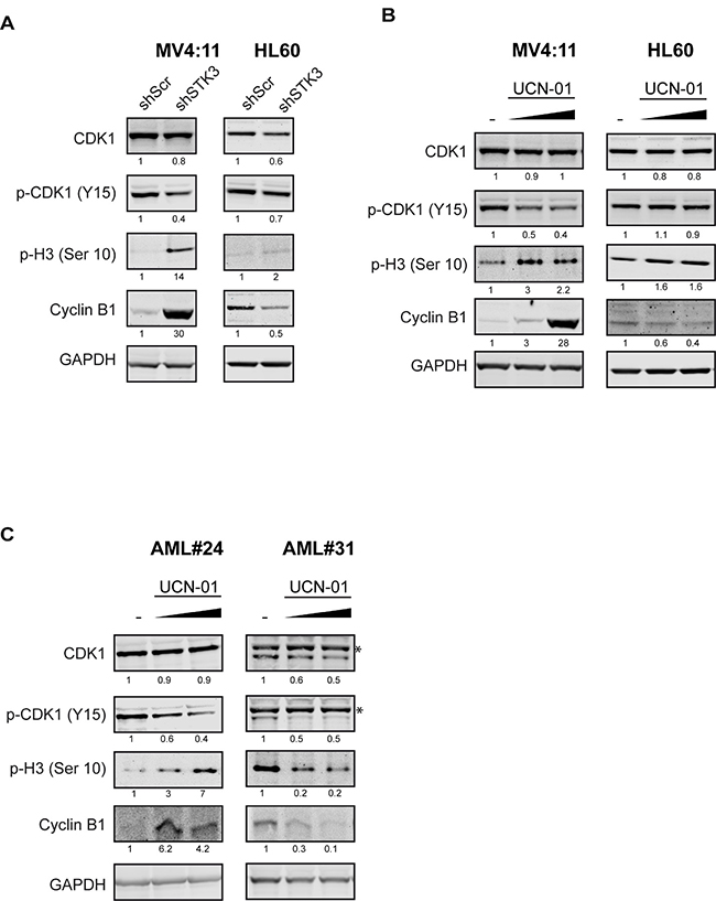 Figure 6: STK3 depletion or inhibition leads to growth inhibition through modulation of CDK1/cyclin B1 activity in sensitive AML cells. (A) Representative western blot analysis of indicated mitosis related proteins and their respective phosphorylated versions (p-) after STK3 knock-down in AML cell lines (MV4:11 and HL60, respectively). (B) Representative western blot analysis of indicated mitosis related proteins and their respective phosphorylated versions (p-) after 4 h treatment with UCN-01 in indicated AML cell lines. (C) Representative western blot analysis of indicated mitosis related proteins and their respective phosphorylated versions (p-) after 18 h treatment with UCN-01 in indicated primary AML cells (AML#24 and AML#31, respectively). Quantifications of bands are shown below the blot image as a percentage of scramble control or vehicle (DMSO) treated control. * indicates unspecific bands.