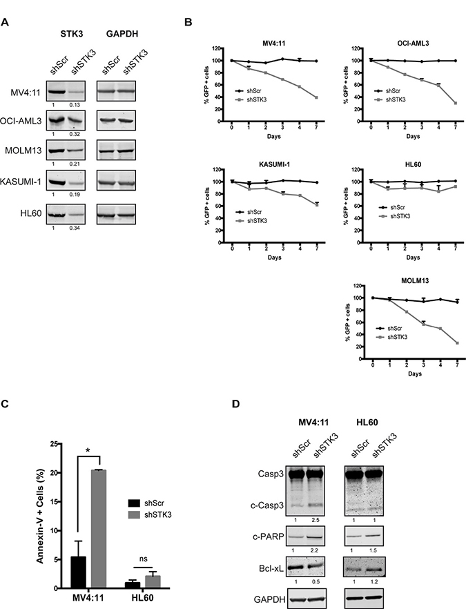 Figure 1: Effects of STK3 knock-down on AML cell lines. (A) Knock-down levels of STK3 protein 3 days post infection are presented for each cell line. The quantitative values corresponding to each band after normalization to a loading control (GAPDH) are given below the western blot image. shScr, shRNA scrambled negative control. shSTK3, shRNA targeting STK3. (B) Indicated AML cell lines transduced with either GFP-tagged STK3 shRNA (shSTK3) or GFP-tagged non-target control shRNA (shScr) vectors. Percentage of GFP positive cells was checked by flow cytometry. GFP percentages normalized to day 2 post infection are presented. Changes in the abundance of GFP positive cells are shown over time. (C) STK3 knock-down induces apoptosis in MV4:11 cells. Quantitative analyses of Annexin V-positive cells after treatment with STK3 shRNA (shSTK3) or control shRNA (shSrc) in indicated cell lines are shown. Data are presented as mean ± SD. Significance was assessed by means of Student t test; *P < 0.05 (D) Expression of apoptosis related proteins after STK3 knock-down examined by western blot assay in MV4:11 and HL60 cells at day 3 post infection is shown. The quantitative values normalized to GAPDH and the control shRNA are given below the western blot images.