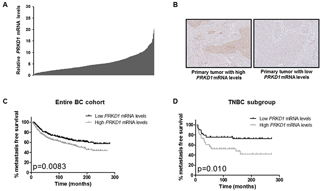 Figure 1: PRKD1 expression is a poor prognostic factor in the entire breast cancer cohort and in the TNBC subgroup. (A) PRKD1 mRNA levels in 527 primary breast tumors. PRKD1 mRNA expression was analyzed by RT-qPCR and normalized to that of the TBP control gene. Normal breast tissues were used as a reference (expression level =10). (B) Immunohistochemical analysis of PKD1 protein expression in primary breast tumors showing high or low PRKD1 mRNA levels (relative PRKD1 mRNA levels of 10.2 and 1.0, respectively). Original magnification x200. (C) Kaplan-Meier analysis of metastasis-free survival according to PRKD1 mRNA expression in the entire breast cancer cohort (n=527). (D) Kaplan-Meier analysis of metastasis-free survival according to PRKD1 mRNA expression in TNBC (n=102).