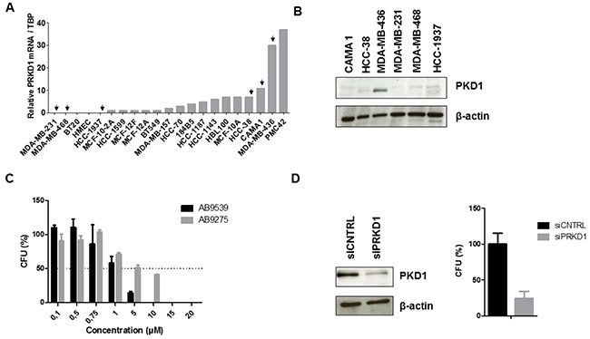 To evaluate the effect of PKD1 pharmacological inhibition in TNBC cells, PRKD1 transcript levels were first analyzed by quantitative RT-PCR in a series of 21 TNBC cell lines. We found that PRKD1 was expressed at the mRNA level in about half of the TNBC cell lines (Figure 2A). PKD1 protein expression was then analyzed by western blot in three cell lines showing PRKD1 mRNA expression (MDA-MB-436, CAMA-1, HCC-38) and in three cell lines in which PRKD1 transcript was not detected (MDA-MB-231, MDA-MB-468, HCC-1937). PKD1 protein expression was observed only in MDA-MB-436 cells (Figure 2B), which also expressed high levels of PRKD1 mRNA. Thus, this cell line was selected to further study the effect of PKD1 inhibition. MDA-MB-436 cells were treated with different concentrations of the AB9539 or AB9275 compounds and colonies were counted after two weeks. Interestingly, both molecules were able to reduce colony formation, with an IC50 of 2.0 μM and 4.1 μM for AB9539 and AB9275, respectively (Figure 2C). Importantly, PKD1 silencing also resulted in a marked inhibition of clonogenicity in MDA-MB-436 cells (Figure 2D).