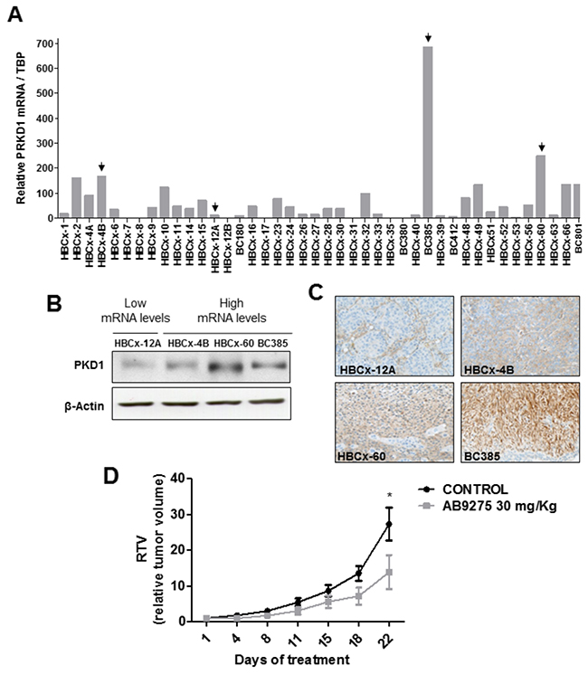 In order to select a relevant in vivo model, PKD1 expression was analyzed in a panel of 41 TNBC PDXs. PRKD1 mRNA expression was detected by quantitative RT-PCR in about half of the PDXs (Figure 3A). The three xenografts showing the highest PRKD1 mRNA levels (BC385, HBCx-60 and HBCx-4B) were selected for further experiments. The HBCx-12A model, expressing low PRKD1 mRNA levels, was selected as a negative control. High PKD1 protein expression was confirmed by western blot and immunohistochemistry in BC385, HBCx-60 and HBCx-4B (Figure 3A–3C). Conversely, PKD1 protein expression was low in the HBCx-12A model (Figure 3A–3C). The HBCx-60 PDX model, which expresses the highest levels of PKD1 protein (Figure 3B–3C), was selected for in vivo evaluation of AB9275 activity.