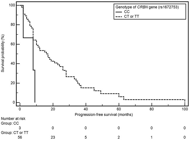 Table 1: Patient characteristics with reference to the occurrence of CRBN gene genotypes (rs6768972 and rs1672753)