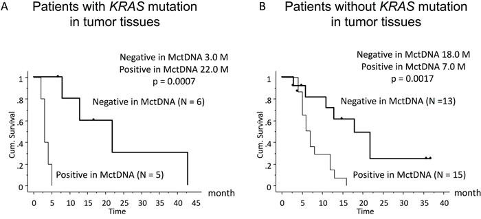 The KRAS status in ctDNA was determined using ddPCR (Bio-Rad, Tokyo, Japan). Seven KRAS mutations (G12D, G12V, G12C, G12R, G12A, G12S, and G13D) were assessed. The ddPCR mixture contained 10 μL of 2 × ddPC Supermix, 250 nM of forward and reverse primers, 62.5 nM MT and WT probe, and 8 μL of sample eluted from plasma. The reaction mixture (20 μL) was loaded into a DG8 cartridge (Bio-Rad) with a gasket and the cartridge was placed into the droplet generator, according to the manufacturer’s instructions. The generated droplets were transferred into a 96-well plate and sealed using a foil lid and a thermal plate sealer. After heat sealing, PCR was performed using a Veriti thermal cycler (Thermo Fisher Scientific, Waltham, MA, USA) under the following conditions: 10 min at 95°C, 39 cycles at 94°C for 30 s, then at 60°C for 60 s. Amplified droplets were analyzed using a QX200 droplet reader (Bio-Rad) for fluorescent measurement of FAM probes for WT and HEX for MT. ddPCR data were analyzed using QuantaSoft software. Amplified DNA products were extracted from droplets following PCR for Sanger sequencing. Samples with two or more positive droplets were determined as positive. To explore the reproducibility and sensitivity of the methods, for instance, a tumor with a known mutation that is also found in the plasma could be spiked into DNA samples from other cases to see if the mutation could be detected at varying dilutions.