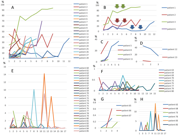 Figure 3: Changes in MctDNA during treatment in 29 patients with mutations in tumor tissues (A), representative graph of four patients with stable levels of MctDNA (B), four patients with increases (C), and two patients with decreases (D). Changes in MctDNA during treatment in 28 patients without mutations in tumor tissues (E), representative graph of nine patients with intermittent changes in MctDNA (F), three patients with increases (G), and seven patients with a spike in elevation (H). Y axis shows ratio of MctDNA (%) and X axis shows timing of blood examination.