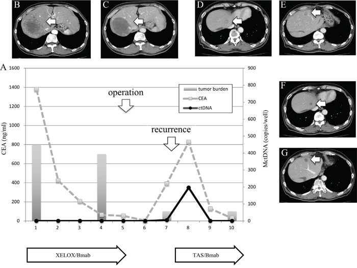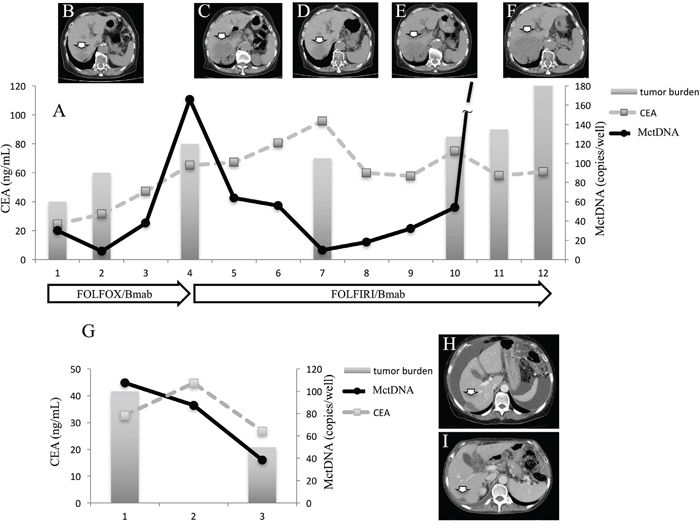 Figure 4: Clinical course of a mCRC patient with multiple liver metastases with a long stable disease (A and G) and computed tomography (CT) (B–F). A 75-year-old woman with multiple liver metastases is denoted as patient 1. She was treated with FOLFOX + bevacizumab for the first-line treatment. (A) and (B) show CT images before and after treatment with FOLFOX + bevacizumab. Increased levels of MctDNA were observed before radiological progression (B). FOLFIRI + bevacizumab was administrated as the second-line treatment. The tumor did not change in size (C, D, and E) and levels of MctDNA were stable for a time with the second-line treatment. Progression-free survival of 6 months was achieved with stable levels of MctDNA (A), followed by progression detected by CT (F). A 66-year-old woman with multiple liver metastases and ascites is denoted as patient 12. She was treated with XELOX + bevacizumab for the first-line treatment. (H) and (I) show CT images before and after treatment with XELOX + bevacizumab. The tumor shrank and levels of MctDNA decreased (I). Arrow shows liver metastasis. CEA: carcinoembryonic antigen.
