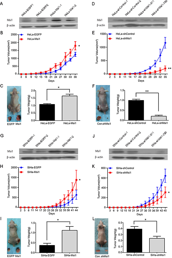 Figure 2: Msi1 enhances tumor formation by cervical cancer cells in vivo. Western blot analysis of Msi1 protein in HeLa-EGFP and HeLa-Msi1 cells (A) HeLa-shControl and HeLa-shMsi1 cells (D) SiHa-EGFP and SiHa-Msi1 cells (G) and SiHa-shControl and SiHa-shMsi1 cells (J) β-actin served as the loading control. Tumor formation assays were performed with 6 mice per group. The tumor growth curves were calculated by monitoring that was performed every 3 days post-transplant. At 36 days post-transplant for HeLa-Msi1 cells (B) 35 days post-transplant for HeLa-shMsi1 cells (E) 44 days post-transplant for SiHa-Msi1 cells (H) and 45 days post-transplant for SiHa-shMsi1 cells (K) the xenograft tumors of mice in each group were dissociated and weighed (C, F, I and L). The data are shown as the mean± S.E.M. *P < 0.05; **P < 0.01.