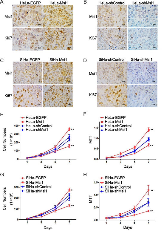 Figure 3: Msi1 promotes the proliferation of cervical cancer cells in vitro and in vivo. Immunochemistry for Msi1 and Ki-67 is shown in tumor xenografts of HeLa-EGFP and HeLa-Msi1 cells (A) HeLa-shControl and HeLa-shMsi1 cells (B) SiHa-EGFP and SiHa-Msi1 cells (C) and SiHa-shControl and SiHa-shMsi1 cells (D). Cell proliferation in vivo was determined by counting the cells for Msi1-modified HeLa cells (E) and Msi1-modified SiHa cells (G). A cell viability assay (3-[4,5-dimethylthiazole-yl]-2,5-diphenyl tetrazolium bromide) was performed for Msi1-modified HeLa cells (F) and Msi1-modified SiHa cells (H). The data are presented as the mean± S.E.M. *P < 0.05; **P < 0.01.