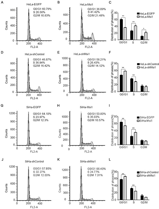 Figure 4: Msi1 accelerates the transition of the cell cycle from the G0/G1 phase into the S phase in cervical cancer cells. The cell cycles of HeLa-EGFP (A) and HeLa-Msi1 (B) were monitored with fluorescence-activated cell sorting (FACS) analysis, and a quantitative analysis of the cell cycle distribution is shown, respectively (C). The cell cycles of HeLa-shControl (D) and HeLa-shMsi1 (E) were monitored with FACS analysis, and a quantitative analysis of the cell cycle distribution is shown, respectively (F). The cell cycles of SiHa-EGFP (G) and SiHa-Msi1 (H) were monitored with FACS analysis, and a quantitative analysis for the cell cycle distribution is shown, respectively (I). SiHa-shControl (J) and SiHa-shMsi1 (K) cells were monitored with FACS analysis, and a quantitative analysis of the cell cycle distribution is shown, respectively (L). The data were analyzed and are presented as the mean±S.E.M. * P < 0.05, ** P < 0.01.
