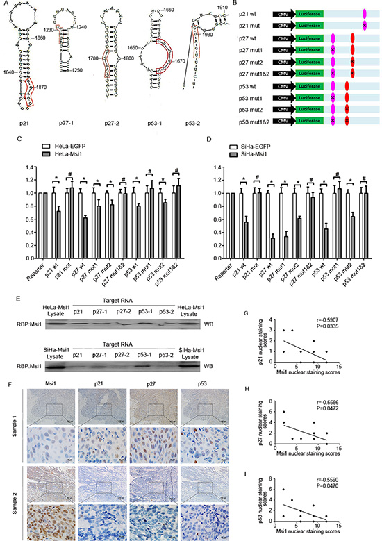 Figure 6: Msi1 Binds to the 3’UTR of p21, p27 and p53 and represses their translation. (A) Secondary RNA structure surrounding the Msi1 binding sites in p21, p27 and p53 as predicted by the RNAstructure 4.6 software. p21 has only one proven Msi1 binding site, p27 has two predicted Msi1 binding sites (p27-1 and p27-2), and p53 has two predicted Msi1 binding sites (p53-1 and p53-2). (B) Schematic representation of the reporter construct containing the firefly luciferase coding sequence fused to the p21 3’UTR/p27 3’UTR/p53 3’UTR. The predicted binding site regions within the wild-type p21 3’UTR/p27 3’UTR/p53 3’UTR are noted in colored ovals, and the residues altered in the p21 3’UTR/p27 3’UTR/p53 3’UTR mutants construct are marked on the ovals. Luciferase reporter assays are shown for p21, p27 and p27 targeted by Msi1 in HeLa-Msi1 (C) and SiHa-Msi1 cells (D). The histogram shows the ratio of firefly to Renilla luciferase activity normalized to empty vector-transfected cells (baseline). The data are shown as the mean± S.E.M. * P < 0.05. (E) The RNA-Msi1 binding assay shows associations of binding sites of p21, p27-1, p27-2, p53-1 and p53-2 with Msi1 protein in HeLa-Msi1 cells(upper) and SiHa-Msi1 cells(lower). (F) The expression of Msi1 and p21, p27 and p53 in 13 cervical cancers specimens. The expression levels of two representative samples are shown. The Msi1, p21, p27 and p53 staining were scored from 1 to 12. The correlation was determined by Pearson’s correlation test. (G) The correlation between Msi1 and p21 was significant (r=-0.5907, P=0.0335). (H) The correlation between Msi1 and p27 was significant (r=-0.5586, P=0.0472). (I) The correlation between Msi1 and p53 was significant (r=-0.5590, P=0.0470).