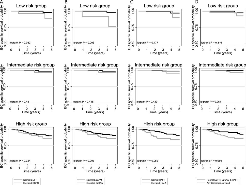 Figure 2: Bladder cancer specific survival curves for normal and elevated biomarker test results for (A) EGFR, (B) EpCAM, (C) HAI-1 and (D) combination of all three biomarkers, within each EAU risk group in NMIBC patients.