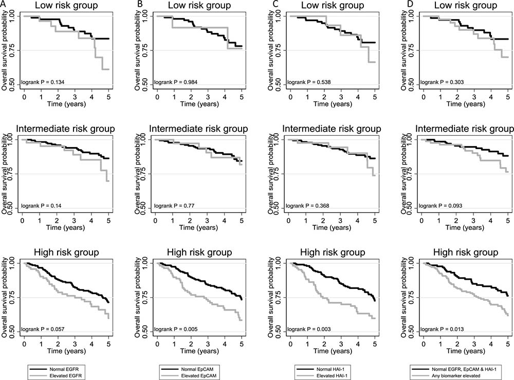 Figure 3: Overall survival curves for normal and elevated biomarker test results for (A) EGFR, (B) EpCAM, (C) HAI-1 and (D) combination of all three biomarkers, within each EAU risk group in NMIBC patients.