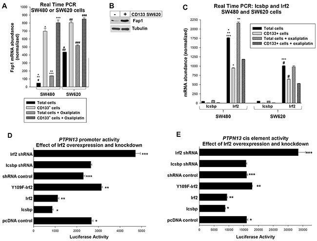 Figure 1: Fap1 expression is increased in CD133+ colon cancer cells and the PTPN13 promoter is regulated by Irf2. (A) Expression of Fap1 is correlated with CD133+ cell abundance in colon cancer cell lines. Total SW480 or SW620 cells, or CD133+ cells isolated from these lines, were analyzed for Fap1 mRNA by real time PCR. Significant differences are indicated by *, **, ***, #, ##, or ### (p<0.01, n=6 for all comparisons). (B) Fap1 protein is more abundant in CD133+ cells vs CD133- cells. CD133+ cells that were isolated from the SW620 line were compared to CD133- cells by Western blot of total lysate proteins. Blots were probed from Fap1 and Tubulin (as a loading control). (C) Irf2 expression is decreased in CD133+ cells vs the total SW480 or SW620 cell population, and significantly less Icsbp is expressed in these cells compared to Irf2. Total SW480 or SW620 cells, or CD133+ cells isolated from these lines, were analyzed for Icsbp or Irf2 mRNA by real time PCR. Significant differences are indicated by *, **, ***, or # (p<0.01, n=6 for all comparisons). (D) Irf2 represses the PTPN13 promoter. SW620 cells were transfected with a construct with 1.0 kb of PTPN13 promoter linked to a luciferase reporter and vectors to overexpress Icsbp, wild type Irf2, or Y109F-Irf2 (versus empty control vector), or to knockdown Icsbp or Irf2 (with specific shRNA versus scrambled shRNA vector). Significant differences indicated by *, **, or *** (p<0.001, n=6 for all comparisons). (E) Irf2 represses the Icsbp-binding cis element from the PTPN13 promoter. SW620 cells were transfected with a construct with three copies of the previously identified PTPN13 cis element linked to a minimal promoter and luciferase reporter. Cells were co-transfected with vectors to overexpress or knockdown Icsbp or Irf2, as described above. Significant differences indicated by *, **, or *** (p<0.001, n=6 for all comparisons).