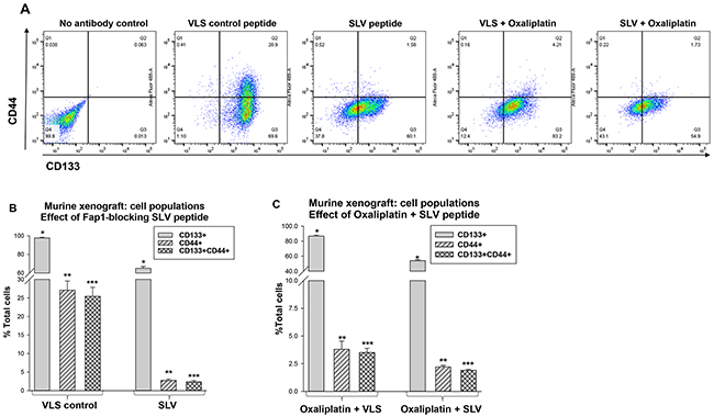 Figure 5: Fap1-inhibition decreases abundance of CD133+CD44+ cells in in a murine xenograft model of colon cancer with or without oxaliplatin. Tumors from the mice described above were analyzed for cell population distribution after various treatments. (A) Histograms from flow cytometry demonstrate decreased abundance of CD133+CD44+ cells after treatment with SLV peptide with or without oxaliplatin. A representative histograms for each cohort is shown. (B) Treatment with SLV peptide decreases relative abundance of CD133+CD44+ cells in xenograft tumors. Tumors were simultaneously harvested from mice treated with SLV peptide versus VLS control (when control group tumors were >2,000 mm3) and analyzed for CD133 and CD44 expression by flow cytometry. Significant differences indicated by *, **, or ***. (p<0.001, n=6). (C) The addition of SLV peptide to oxaliplatin treatment decreases relative abundance of CD133+CD44+ cells in xenograft tumors. Tumors were simultaneously harvested from mice treated with oxaliplatin + SLV peptide versus VLS control (when control group tumors were >2,000 mm3) and analyzed for CD133 and CD44 expression by flow cytometry. Significant differences indicated by *, **, or ***. (p<0.001, n=6).