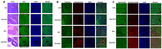 We were interested in determining if Fap1-inhibition activated Fas or Gsk3β in CD133+ colon cancer stem cells. To investigate this, xenograft tumors from mice treated with VLS control peptide, SLV Fap1-blocking peptide, or oxaliplatin with VLS or SLV peptide were analyzed for co-localization of CD133 and phospho-Fas or phospho-Gsk3β. We found phosphorylation of Fas (Figure 7A) or Gsk3β (Figure 7B) in viable CD133+ tumor cells from mice treated with SLV peptide, which increased in mice undergoing combined treatment with oxaliplatin and SLV.
