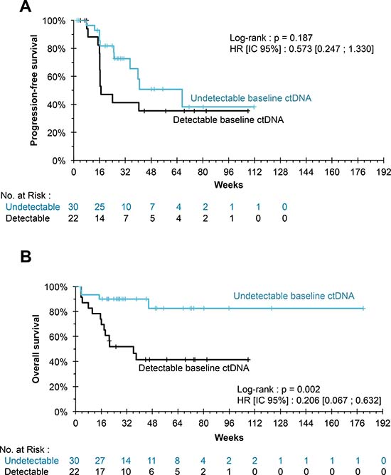 The Kruskall–Wallis test and the Chi-square test were used to compare patient characteristics. The criteria we established for the evaluation of ctDNA kinetics were defined and evaluated using ROC curves. The survival probabilities were estimated using the Kaplan–Meier method and compared using a log-rank test. Finally, the association between biological response criteria and OS or PFS were estimated using a Cox proportional hazards model with time-dependent covariate and evaluated using the Wald test. The Firth’s penalized likelihood was used, because of the monotone likelihood associated with some variables. The variables included in the multivariate analysis were the presence of lung metastases, the presence of non-lung visceral metastases, baseline LDH activity, and baseline concentration of ctDNA.