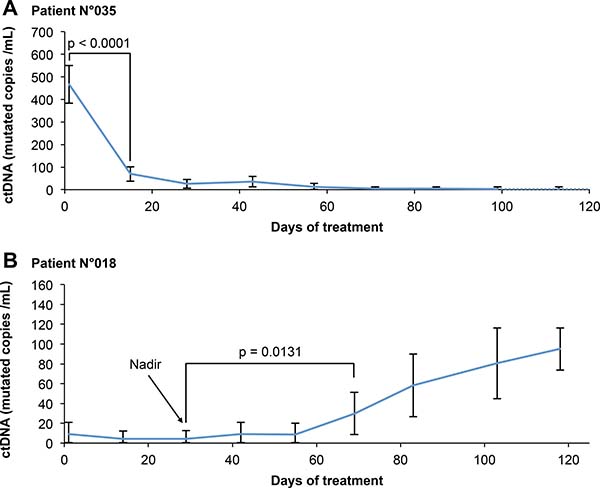 The monitoring of ctDNA required that the mutation be detectable in circulating DNA at baseline. In our cohort, the low detection rate at the initiation of treatment (43%) is one of the main limitations of our biological monitoring model. However, patients with undetectable ctDNA at baseline have a higher survival rate, and a radiological evaluation might be sufficient.