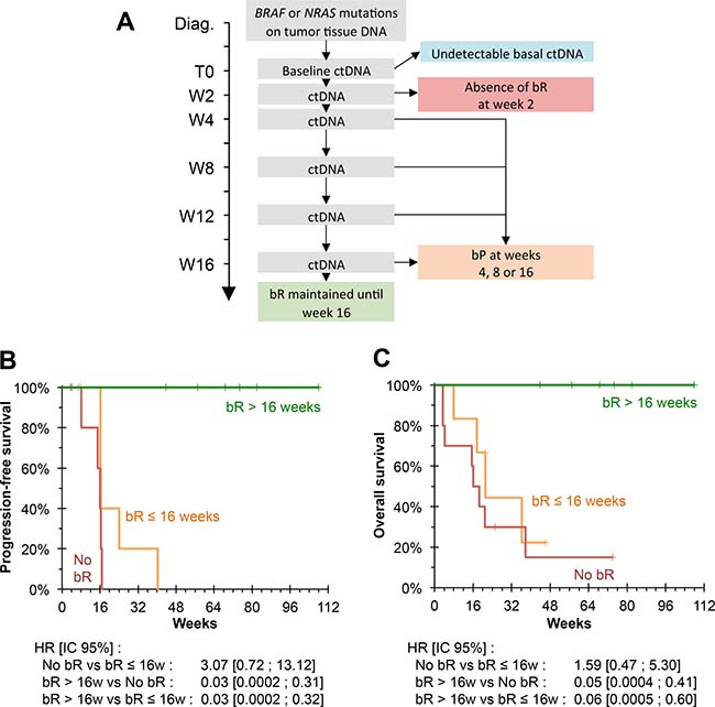 Our study is the first to establish quantitative biological response and biological progression criteria for the interpretation of ctDNA kinetics. We defined biological response (bR) as a significant decrease in plasma ctDNA compared to the baseline level considering the dPCR precision. Similarly, biological progression (bP) was defined as a significant increase in ctDNA compared to the nadir. Within our cohort, maintenance of a bR until week 16 was 100% predictive of a prolonged response and survival, independently of other prognostic factors. Conversely, the absence of bR as early as week 2 was associated with a 0% response rate and a short PFS (<120 days).