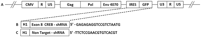5′_GAGAGAGGTCCGTCTAATGTTCAAGAGACATTAGACGGACCTCTCTCTTTTT (pACE-CREB). 5′_ACCAAGATGAAGAGCACCAACCTGAACCATTGGTGCTCTTCATCTTGGTTTTTTT (pACE-NT. Non-target shRNA). See Figure 1 for a schematic presentation of the vectors.