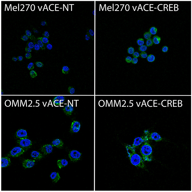 GFP fluorescence from cells infected with vACE-GFP served to determine the kinetics of spread of the virus in Mel 270 and OMM2.5 cells in culture. The efficiency of infectivity was verified by immunofluorescent staining of the vACE-CREB and vACE-NT infected cells. It takes about three weeks for GFP fluorescence to indicate that about a 100% of the vACE-GFP cells were infected. At the same time, immunofluorescence analyses (Figure 2) and qPCR ratio of the viral env gene vs. the endogenous RNaseP (not shown) in cells infected with either RCR showed that about 90% of the cells were infected with either vACE-NT or vACE-CREB.