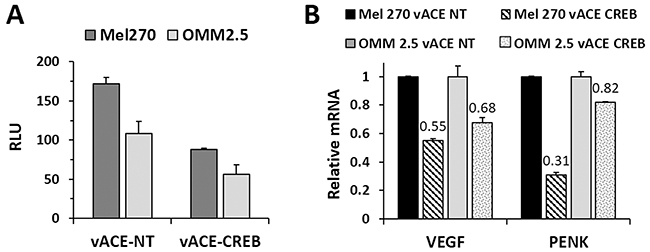 Figure 4: Functional analysis of the effect of CREB knockdown in Mel 270 and OMM2.5 infected cell. The effect on the activity of CREB in the RCR-infected cells was determined in two ways: luciferase reporter gene and knockdown of downstream genes. (A) The infected cells were co-transfected with a CRE-mediated luciferase (luc) reporter plasmid vector, pCREluc together with an expression vector expressing the Renilla luciferase gene, phRLSV40, as a transfection control. The results were normalized to Renilla luciferase activity. (B) Purified mRNA was quantified following RT-qPCR. The levels of mRNA of VEGF and PENK in vACE-CREB infected cells were normalized to β-actin mRNA levels and to the levels of VEGF and PENK in vACE-NT infected cells, p<0.05.