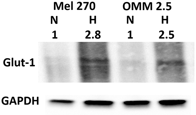 Figure 6: Cellular response to hypoxia. Mel270 and OMM2.5 cell lines were cultivated in normoxic (N) and hypoxic (H) conditions for 48 hours and the relative expression of Glut-1 (50 kDa) was determined by Western blot analysis. Band intensities were normalized to GAPDH (37 kDa), and the intensities of hypoxia were normalized to those in normoxia.