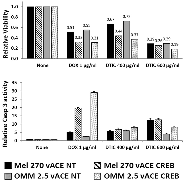 In the complimentary viability and activation of the Caspase-3 assay, cells not treated with either DOX or DTIC and harboring stably either vACE-NT or vACE-CREB were defined as 100% (non-treated cells) (Figure 8).