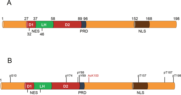 Figure 1: Representation of the key functional domains of p27 along with the most relevant post-translational modifications. (A) The N-terminal domain of p27 includes the kinase inhibitory domain (KID) that consists of three subdomains: the cyclin-binding subdomain (D1), the Cdk-binding subdomain (D2) and a linker subdomain that joins D1 and D2 (LH). This region also includes a nuclear export signal (NES). In the region subsequent to the KID domain there is a proline rich domain (PRD) (aa 89-96). The C-terminal domain of p27 is an intrinsically disordered region that contains a nuclear localization signal (NLS). (B) The most relevant sites of phosphorylation are represented in black. The specific site of acetylation (K100) is marked in red.