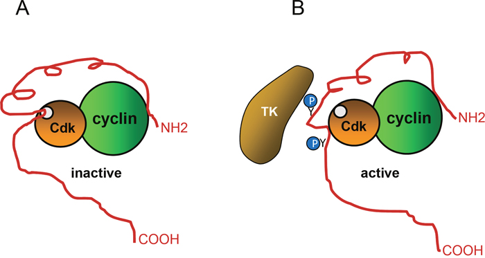 Figure 2: Regulation of p27 activity by phosphorylation. (A) To inhibit cyclin-Cdk activity, p27 associates with both, the cyclin subunit and the Cdk. A p27 portion is introduced into the catalytic center of the Cdk, This portion competes with ATP thus, blocking the transfer of phosphate to the substrates. (B) Phosphorylation of specific tyrosine (Y74 and Y88) residues of p27 by different tyrosine kinases (TK) generates a conformational change that separates the inhibitory region from the catalytic cleavage of the Cdk, leading to its partial activation.