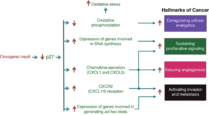 Figure 6: Role of the transcriptional regulatory function of p27 in cancer. This scheme summarizes how the decrease of p27 levels observed in many different types of human tumors participates in tumor progression and malignancy. The decrease of p27 produced by oncogenic stimuli induce the deregulation of the expression of genes involved in cellular functions that facilitates the acquisition of tumor capabilities that are defined as Hallmarks of cancer. Specifically, by deregulating genes involved in oxidative phosphorylation and cell proliferation, genes encoding chemokines and their receptors and genes involved in the generation of ad hoc metastatic niches, p27 decrease in facilitates tumor progression and malignancy.