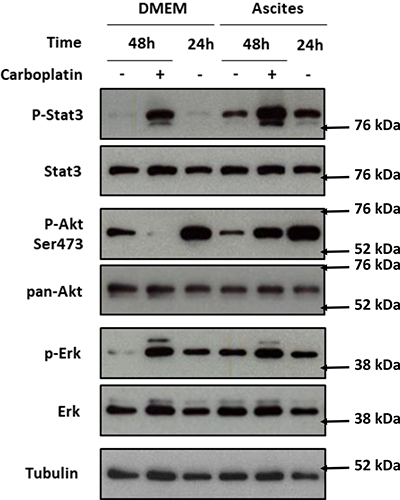 Figure 2: PI3K/Akt, STAT3 and MAPK protein pathway activation after IGROV-1 incubation with ascites and treatment with carboplatin. IGROV-1 cells were exposed to DMEM alone (DMEM) or mixed with 50% ascites (Ascites) for the indicated time. Twenty four hours after cell seeding (recorded 24 h), they were treated with (+) or without (–) carboplatin for 24 h more (recorded 48 h). Akt, Erk and Stat3 level and their activating phosphorylation were analyzed by western blot. The protein expression was normalized to tubulin expression. The expression levels of the phosphorylated forms of Akt, Erk and Stat 3 were normalized to that of their corresponding total protein.