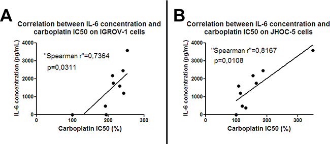 Figure 3: Correlation between IL-6 and chemoresistance: IGROV-1 cells (A) or JHOC-5 cells (B) were exposed to eight patient-derived ascites samples containing different concentrations of IL-6. Cells were treated with different concentrations of carboplatin 12 hours later, then after another 48 hours the cell viability was evaluated. IC50 of carboplatin was determined and correlated with the amount of IL-6. Spearman rank correlation was used to test the correlation between IC50 and IL-6 concentration in ascites.