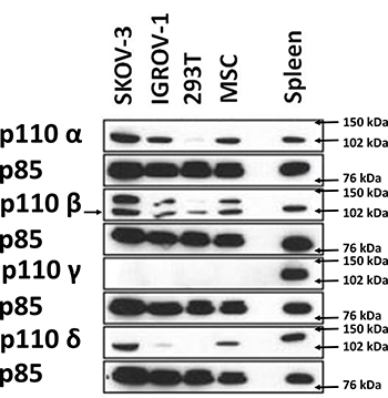 Figure 5: Western blot analysis demonstrating the expression of different class I PI3K isoforms on 2 HOCC lines as well as on mesenchymal stem cells from the tumor microenvironment. Human embryonic kidney cells (HEK 293) were used as negative control, while immune cells of splenic tissue known to express high levels of p110δ and p110γ were used as positive control for expression levels of these isoforms. The expression of PI3K isoforms was normalized to p85 expression.