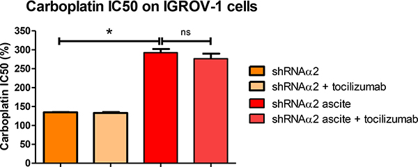 Figure 4: Effect of tocilizumab treatment on ascites in the chemoresistance acquisition of two HOCC lines: JHOC-5 (A) and IGROV-1 (B). Cells were treated with 8 different ascites samples combined or not with tocilizumab (1 μM) for 12 hours. Carboplatin was then added and cell viability was evaluated 48 h later. Results correspond to mean ± SEM of triplicates of experiments performed using 8 different ascites samples.