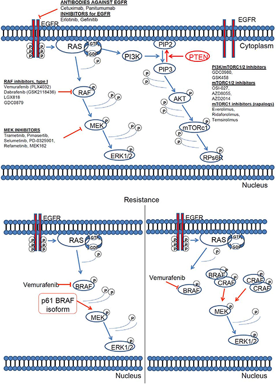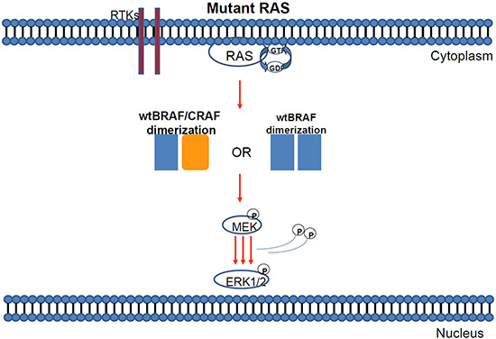 RAS and several of its downstream effectors, including BRAF, have been shown to be commonly mutated in a broad range of human cancers and biological studies have confirmed that RAS pathway activation promotes tumour initiation, progression and metastatic spread in many contexts. Current efforts concentrate on developing inhibitors of RAS and its key downstream effectors, BRAF, MEK, ERK [127, 130] as well as on the need for mutational testing of RAS/ BRAF before proceeding to the clinical setting, Table 1.