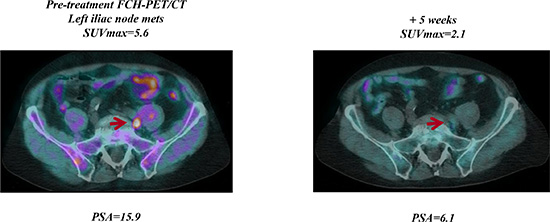 Figure 1: Early FCH-PET/CT complete response on abiraterone treatment. Baseline FCH-PET/CT shows a single left iliac nodal lesion, 5 week FCH-PET/CT resolution correlated with PSA decline and then with undetectable PSA levels (PSA < 0.03 ng/mL) after 6 months of abiraterone therapy.